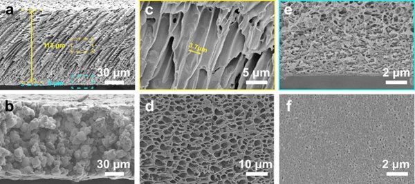 圖3. 聚合物膜SEM圖像。(a)非對(duì)稱(chēng)聚合物膜與(b)多孔膜對(duì)比樣橫截面,(c, d)平行孔道層和(e, f)納米孔層的截面與表面。