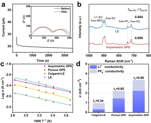 圖4. 電解質(zhì)離子傳輸性能表征。(a)Asymmetric GPE鋰離子遷移數(shù)測(cè)試,(b)拉曼光譜,(c)離子電導(dǎo)率Arrhenius曲線(xiàn)與(d)離子傳輸性能。