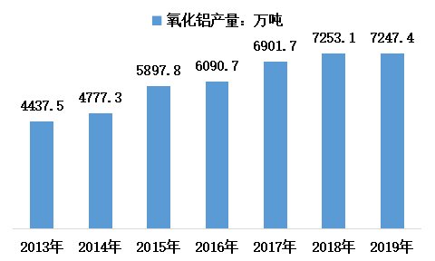 從產量上看,2019年1-12月全國氧化鋁產量為7247.42萬噸,累計下降1%,2019年前12月全國氧化鋁產量不斷增長,2013-2019年我國氧化鋁產量復合增長率8.52%。