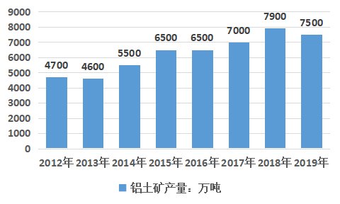 近幾年鋁土礦的國內供應情況又是日益窘迫,除了環保督查、礦山整頓、礦業權出讓制度改革等的政策限制,我國鋁土礦產量受到一定影響。2019年我國鋁土礦產量下降至7500萬噸,相比2018年減少約400萬噸。