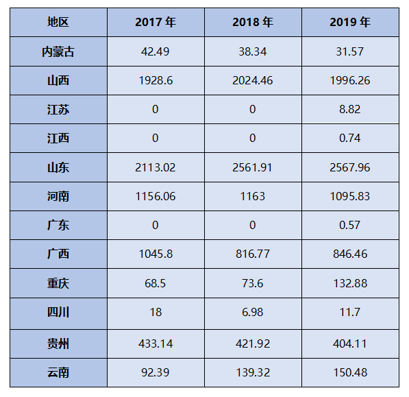 2017-2019年中國主要城市氧化鋁產量 單位:萬噸