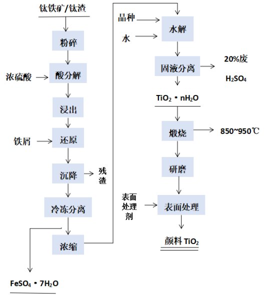 主要以鈦鐵礦或酸溶性鈦渣為原料,用硫酸將鈦原料分解成TiOSiO4溶液再進行除雜、分離,最終獲得成品鈦白粉。