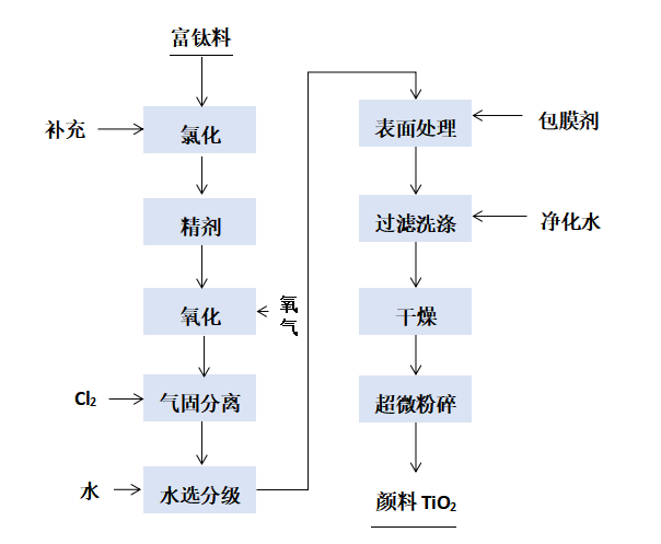 氯化法工藝用富鈦料,如天然金紅石、人造金紅石、高鈦渣或UGS渣等,與氯氣反應生四氯化鈦等,再將精制后的四氯化鈦進行氣相氧化獲得粗二氧化鈦,后處理獲得高品質的鈦白粉。