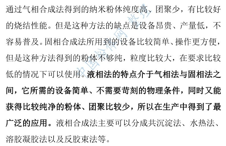 眾所周知,要制備好的氧化鋯陶瓷,第一步便是制備性能優良的粉體。好的粉體要求粒度細而且分布范圍窄。因為超細粉具有很強的擴散能力,所以更容易在燒結后期具有高密度或完全致密。當前,制備氧化鋯粉體的方法可以分為氣相合成法、固相合成法和液相合成法。