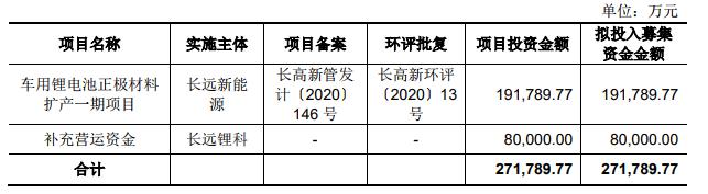 募資用途方面,長遠(yuǎn)鋰科表示本次募集資金扣除發(fā)行費用后,將用于“車用鋰電池正極材料擴(kuò)產(chǎn)一期項目”及補充營運資金,共計27.18億元。其中,車用鋰電池正極材料擴(kuò)產(chǎn)一期項目建設(shè)投資19.18億元,將建成年產(chǎn)4萬噸車用鋰電三元正極材料生產(chǎn)線。詳情如下: