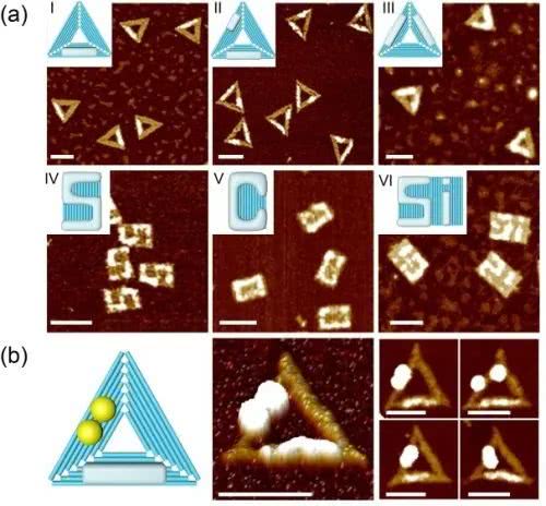 圖2. (a)利用多種DNA折紙結構模板實現二氧化硅納米結構的圖案化定制合成;(b)利用三角形DNA折紙結構模板構建二氧化硅-金球復合結構,為實現進一步功能體系的構筑提供可能。