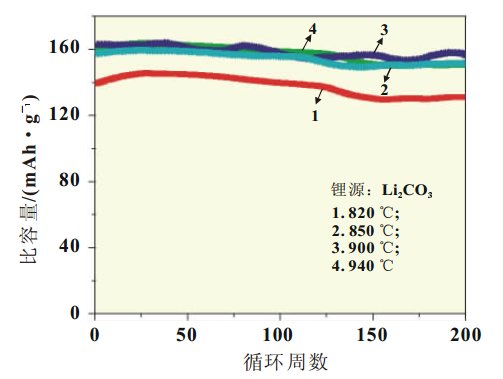 研究表明以氫氧化鋰為鋰源時,只需低溫燒結就可以得到性能優異的材料;而以碳酸鋰為鋰源時,燒結溫度要達到900℃以上,才能得到性能穩定的材料。隨著循環次數增加,以氫氧化鋰為鋰源所制備的材料循環曲線更加平滑,充放電性能更加穩定。