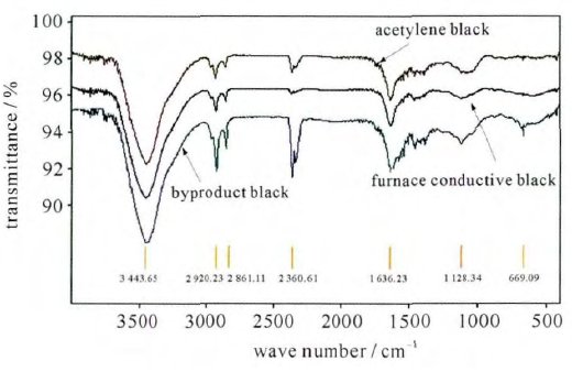 導(dǎo)電炭黑的表面官能團(tuán)對導(dǎo)電炭黑的理化性能及應(yīng)用性能有顯著影響。通過三種導(dǎo)電炭黑的傅里葉紅外光譜(FT-IR)圖,可看出,副產(chǎn)炭黑紅外光譜吸收峰較多,而乙炔炭黑和爐法導(dǎo)電炭黑吸收峰強(qiáng)度相對較弱。副產(chǎn)炭黑吸收峰的強(qiáng)度和數(shù)量均大于乙炔炭黑和爐法導(dǎo)電炭黑,但含氧官能團(tuán)過多降低了其導(dǎo)電性。