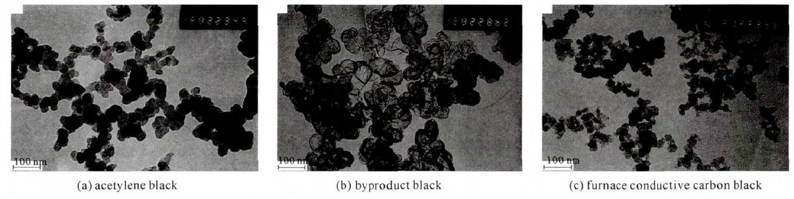 導(dǎo)電炭黑的聚集體結(jié)構(gòu)包含單個炭黑顆粒和炭黑聚集體的形貌與尺寸分布信息,可通過透射電鏡(TEM)獲得其顆粒結(jié)構(gòu)(直觀)信息。三種導(dǎo)電炭黑顆粒呈近似球形,熔聚在一起形成“葡萄串”狀聚集體。爐法導(dǎo)電炭黑粒徑約為20nm,小于乙炔炭黑粒徑(約40nm)和副產(chǎn)炭黑粒徑(約90nm),從圖中還可看出,副產(chǎn)炭黑具有發(fā)達(dá)的支鏈和孔隙結(jié)構(gòu),顆粒呈空殼狀,有利于形成導(dǎo)電通道。
