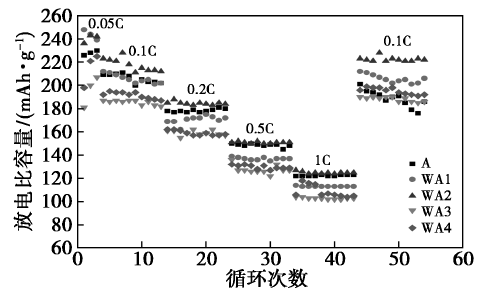 綜合材料結構、形貌與電化學性能分析結果可知,石墨烯包覆提高了富鋰三元正極材料電導率,降低了材料電極極化程度,使得材料團聚度有所下降,因而石墨烯/富鋰三元正極復合材料的比容量和電壓平臺都有所提高,且循環保持率較好。