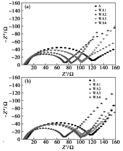 20次(a)、循環100次(b)的交流阻抗譜圖