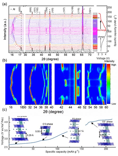 圖3. O3-NNFM材料(a,b)首圈充放電過程中的原位XRD圖譜和2D contour圖,(c)充電過程中的結構演化示意圖