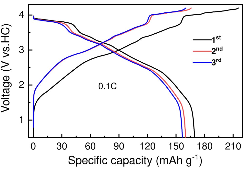 圖4. O3-NNFM正極和硬碳負極全電池在0.5-4.2 V電壓范圍內的前三周充放電曲線