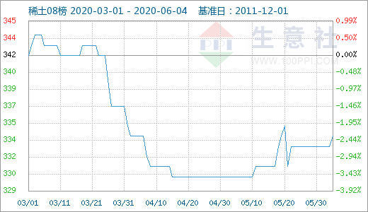 中國(guó)粉體網(wǎng)訊 近期國(guó)內(nèi)輕稀土市場(chǎng)價(jià)格觸底反彈,鐠釹氧化物及鐠釹合金價(jià)格連續(xù)走高,輕稀土市場(chǎng)迎來(lái)“春天”。根據(jù)生意社稀土板塊指數(shù)顯示,6月4日稀土指數(shù)為334點(diǎn),較昨日上升了1點(diǎn),較周期內(nèi)最高點(diǎn)1000點(diǎn)(2011-12-06)下降了66.60%,較2015年09月13日最低點(diǎn)271點(diǎn)上漲了23.25%。(注:周期指2011-12-01至今)。