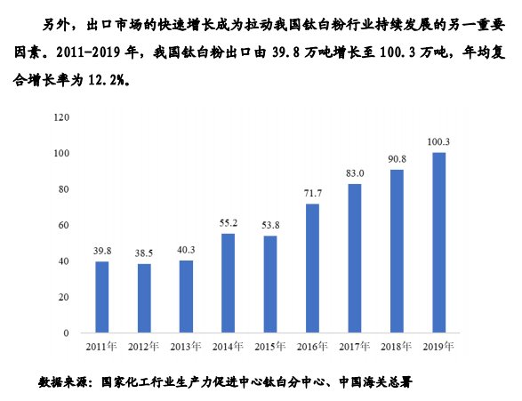 另外,出口市場的快速增長成為拉動我國鈦白粉行業持續發展的另一重要因素。2011-2019年,我國鈦白粉出口由39.8萬噸增長至100.3萬噸,年均復合增長率為12.2%。