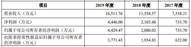 數據顯示,壹石通2017年至2019年期間,營業收入分別為0.75億元、1.16億元、1.65億元;扣非歸母凈利潤分別為0.06億元、0.19億元、0.38億元。詳情如下: