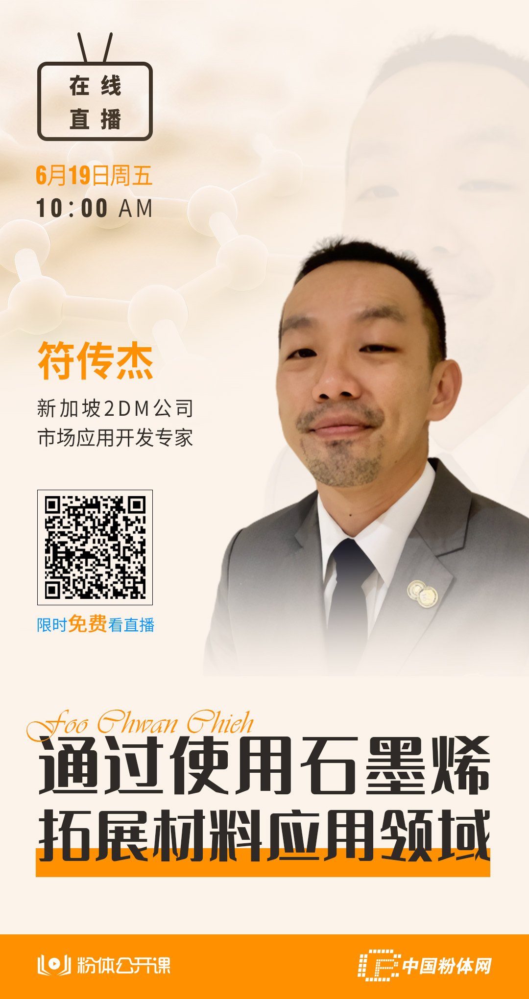 6月19日,來自2DM公司的市場應用開發專家符傳杰先生將走進粉體公開課直播間,做題為《通過使用石墨烯拓展材料應用領域》的精彩報告,屆時他將為大家詳細講解2DM石墨烯生產方式與獨特點以及石墨烯應用方向與好處等方面的內容。