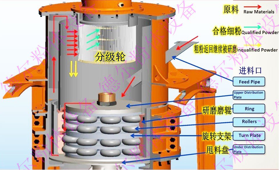 物料經變頻給料機送入粉碎腔內,經磨輥擠壓、剪切、研磨實現物料的超細粉碎。粉碎后的物料被上升的氣流輸送至分級區,在分級輪離心力和風機抽力的作用下,實現粗細粉的分離,達到細度的產品由收集器收集,粗顆粒返回粉碎腔再次粉磨,凈化的空氣由引風機排出。