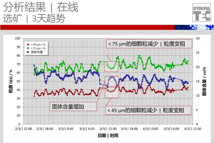 研磨粗細程度直接影響選出率,不同的礦對細度的要求不同。在線粒度檢測系統可以提供粒度變化趨勢,為選礦提供數據,以便找到合適的粒度范圍。