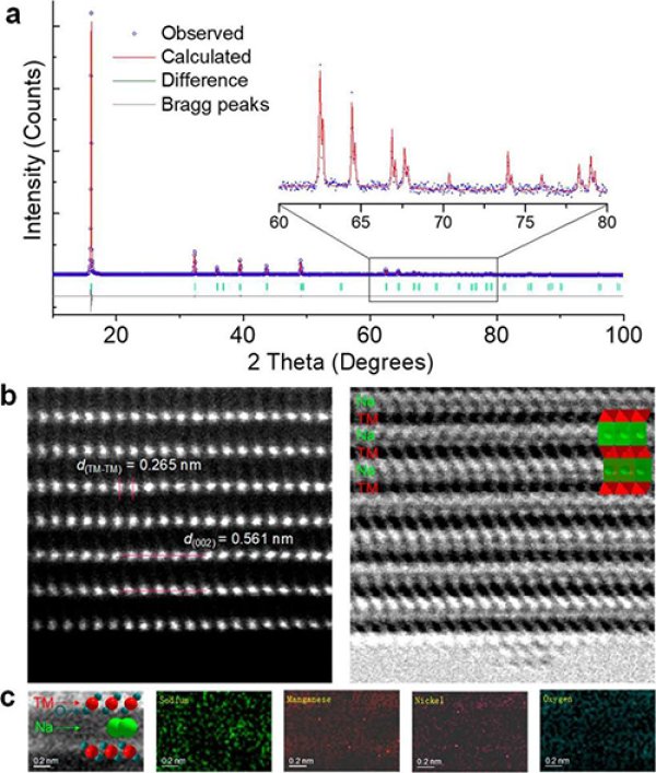 圖2.(a) Na45/54Li4/54Ni16/54Mn34/54O2的XRD譜圖;(b) [010]方向的HAADF和ABF-STEM;(c) Na, Mn, Ni和O的EELS譜