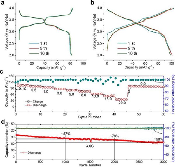 (d) Na45/54Li4/54Ni16/54Mn34/54O2的放電容量保持率
