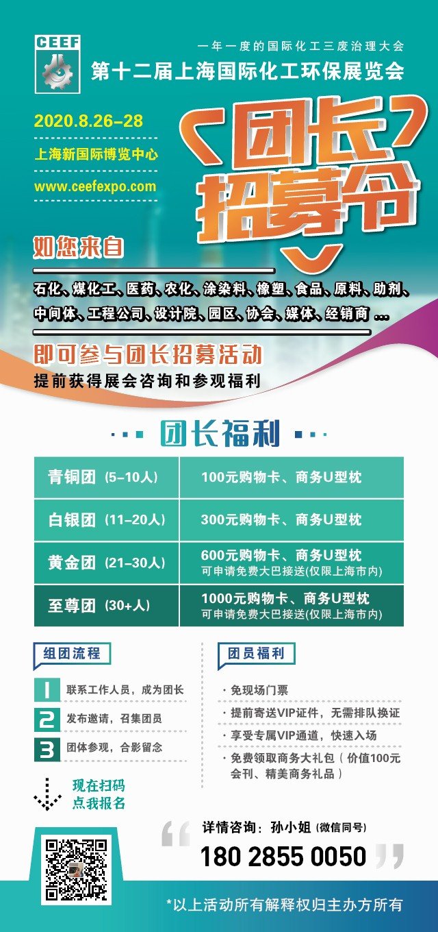為促進產業鏈企業交流合作,推動環保產業實現復蘇增長,CEEF2020第十二屆上海國際化工環保展覽會將于8月26-28日在上海新國際博覽中心舉辦, 展會將吸引工業廢(污)水及污泥處理、工業廢氣回收與治理、危固廢處置、工業清洗及其他化工節能環保等行業領域的企業亮相,集中展示其新產品新技術。