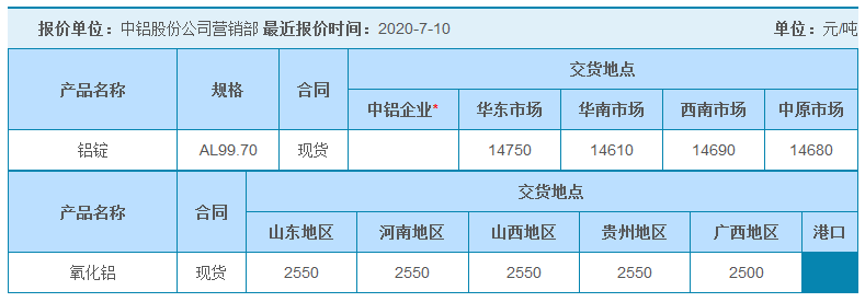中國粉體網訊 繼7月2日發布公告稱對中鋁山西新材料有限公司、山西華興鋁業有限公司涉及產能約180萬噸、共三條氧化鋁生產線實施彈性生產之后,中鋁近日又發布通知稱,根據氧化鋁市場供需變化情況,為提高公司整體盈利能力,自2020年7月9日18:00起,公司在現貨銷售非冶金用氧化鋁時,企業和中鋁國貿執行最低限價2600元/噸,;公司現貨銷售普通氫氧化鋁時,企業、中鋁國貿和中鋁物資執行最低限價1690元/噸。