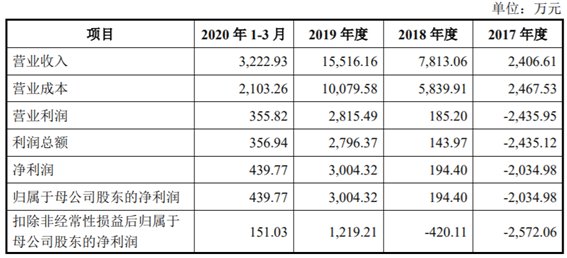 招股書披露,2017年至2019年,天科合達分別實現營業收入2,406.61萬元、7,813.06萬元和15,516.16萬元,歸屬于母公司所有者的凈利潤分別為-2,034.98萬元、194.40萬元、3,004.32萬元,扣除非經常性損益后歸屬于母公司所有者的凈利潤分別為-2,572.06萬元、-420.11萬元、1,219.21萬元。