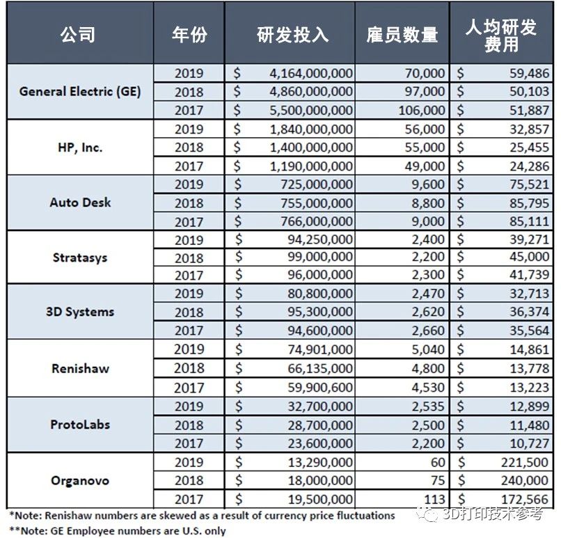 下面的表格列出了八家公司公開的最近三年的研發投入、雇員數量以及每位員工的平均研發費用。這些公司可以分為兩類,分別是以GE和HP為代表的傳統行業企業,另一類是以Stratasys和3D Systems為代表的專門從事3D打印業務的公司。