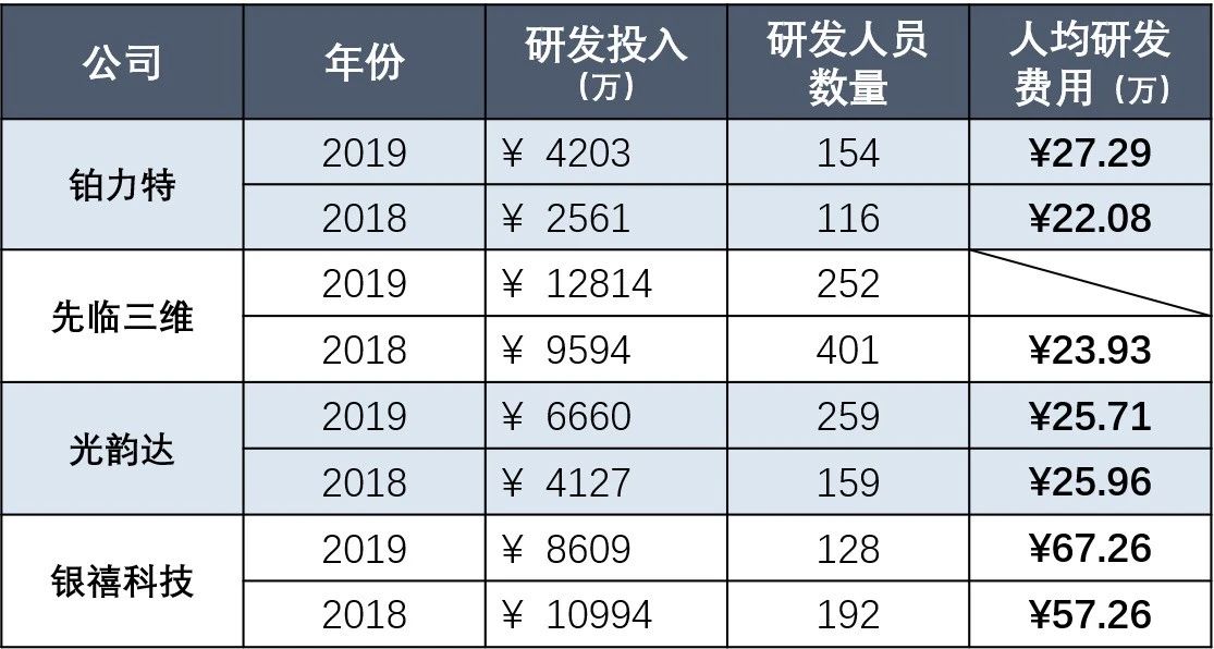 國內方面,筆者查詢了鉑力特和先臨三維2018年的招股書和2019年年報。鉑力特的報告顯示,2018年其研發總投入為2561萬元、研發人員116人,2019年研發投入4203萬、研發人員154人,總投入增加64%,人均年研發費用增長至約27萬。先臨三維所涉及的3D打印業務比鉑力特要復合的多,包括掃描儀、金屬和非金屬以及生物3D打印等,截至2019年底,其研發人員數量為252名,研發總投入超過1.28億,較去年同期增加35.85%。