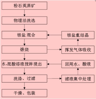 粉石英具有一系列優良的物理化學性質,并且具有顆粒細、純度高、易加工等特點。鄭水林等將物理洗選后的精礦與銨鹽固體粉末混合煅燒,使粉石英中的雜質轉化為水溶性銨鹽,然后將煅燒產物洗滌浸出,干燥獲得高純粉石英。雜質總含量可降低至小于100ppm,Fe含量降低至小于0.5ppm,SiO2含量達到99.99%以上。