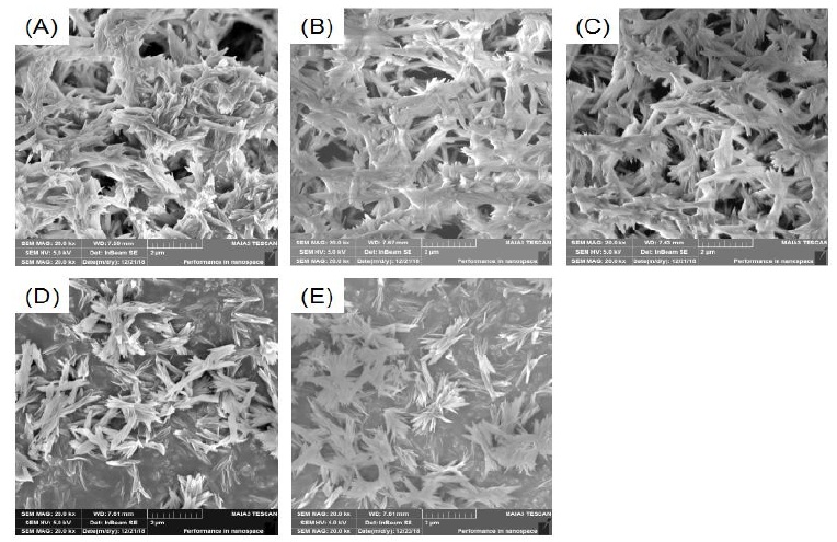 九水硝酸鋁和尿素在200℃不同水熱時間制備勃姆石的SEM圖:(A)1h;(B)2h;(C)3h;(D)4h;(E)8h