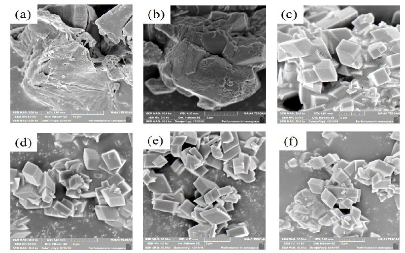 氫氧化鋁在200℃不同水熱時間制備勃姆石的SEM圖:(a)0h;(b)3h;(c)4h;(d)5h;(e)6h;(f)7h