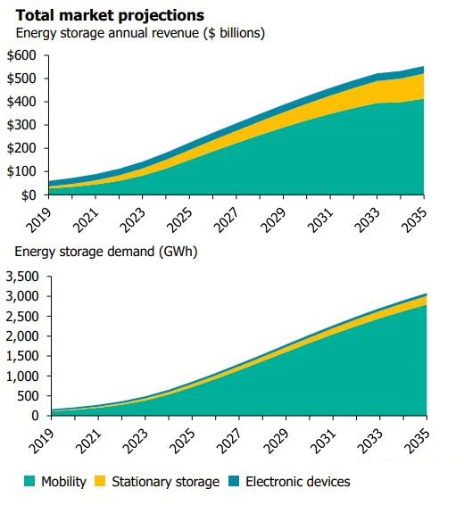 Lux Research發(fā)布了一份名為“Global Energy Storage Market Forecast 2019”的報告,預(yù)測未來15年,全球儲能市場裝機(jī)容量將以更快的速度增長,到2035年,累計裝機(jī)規(guī)模將達(dá)到3046GWh,年復(fù)合增長率為20%,年收入將達(dá)到5460億美元,年復(fù)合增長率為14.9%。