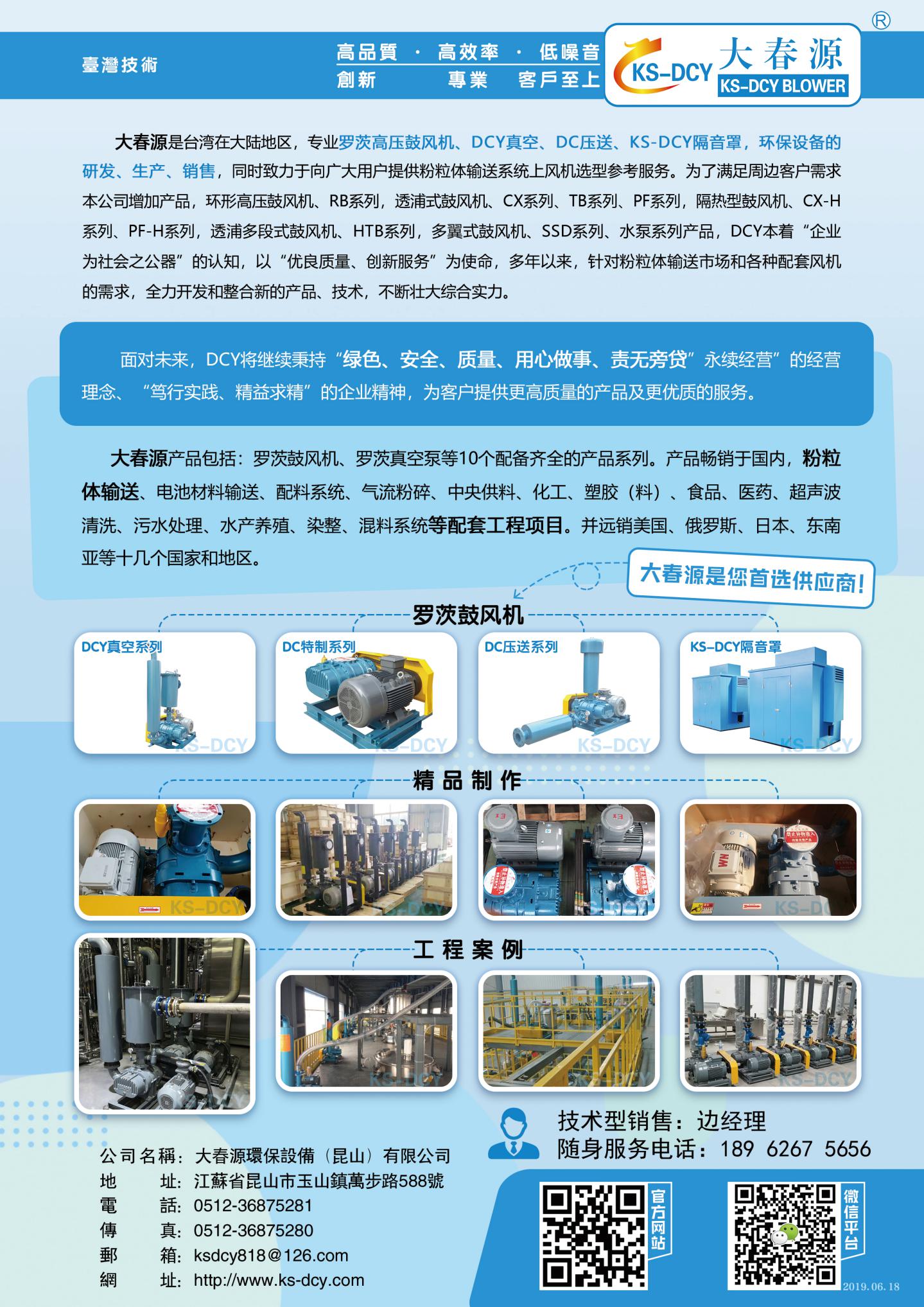 邊經理:我們大春源公司在大陸產銷:羅茨風機、魯氏風機、羅茨真空泵、魯氏真空泵、特制消音器、動力傳動設備、隔音罩、環保設備等系列產品;配套領域包含:新能源、化工、食品、醫藥、農藥、塑膠(橡塑)、相關配混輸送行業,以及污水處理、水產養殖、冶金等行業配套。