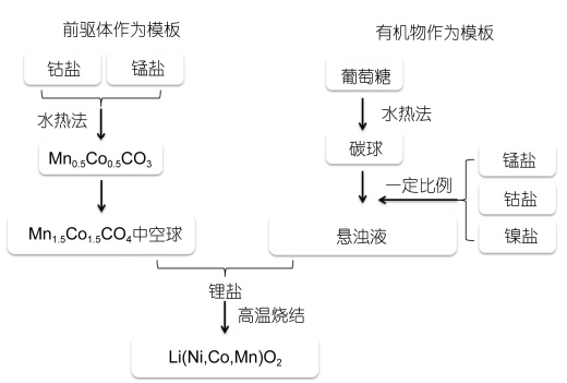 模板法指采用具有一定形貌或是結構的前驅體物質,通過拓撲效應使最終產物能夠將模板劑形貌繼承并保持下來,是一種常見的制備具有一定形貌三元正極材料的方法。