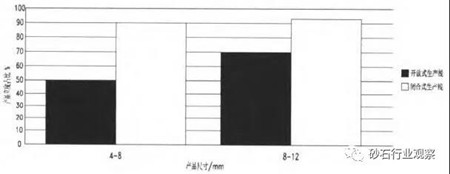 由圖3可得閉合式生產(chǎn)線所生產(chǎn)的產(chǎn)品粒度占比遠(yuǎn)遠(yuǎn)高于開放式生產(chǎn)線。原因是不合格的返料多次破碎,成品形狀更好,特別是細(xì)料產(chǎn)品更突出。