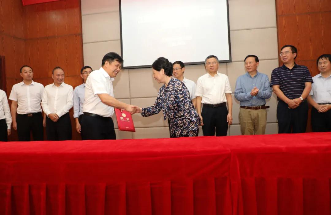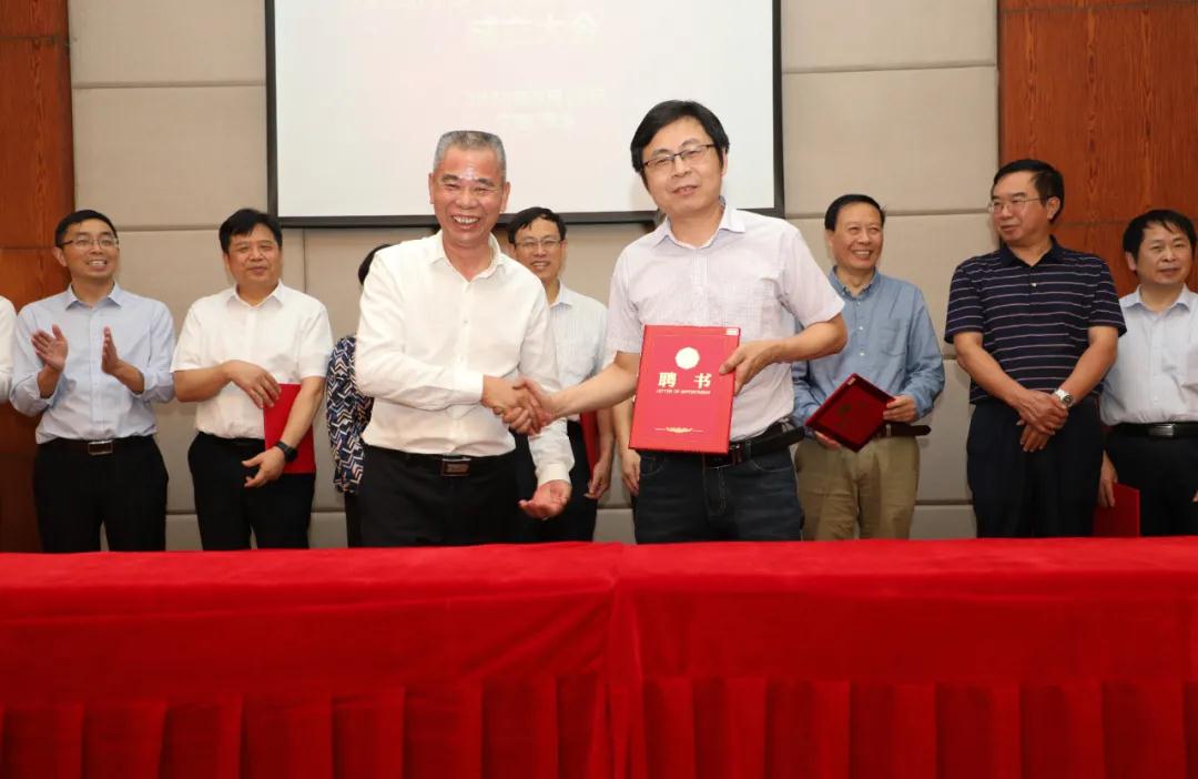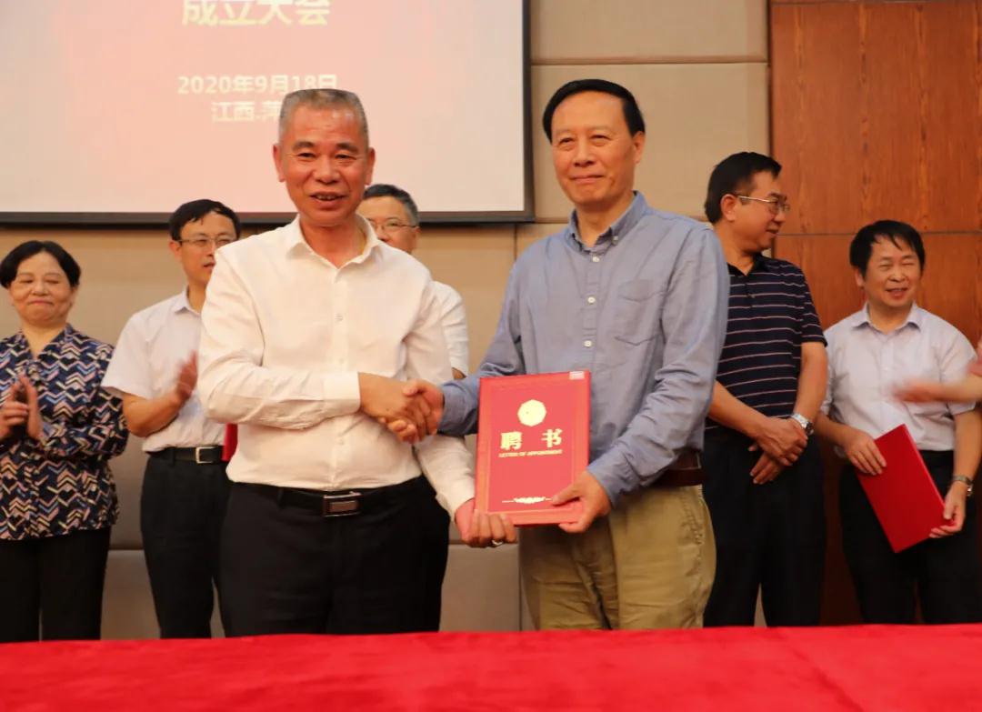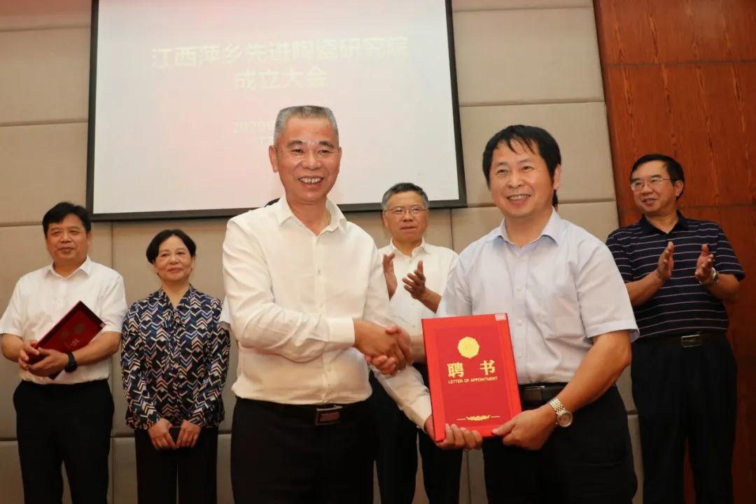 ▲江西萍鄉龍發實業股份有限公司董事長羅接發為研究院院長肖漢寧,常務副院長謝志鵬,副院長喬冠軍、蔡舒、王士維等頒發聘書