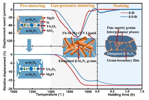 中國科學院上海硅酸鹽研究所研究員曾宇平團隊對高性能氮化硅陶瓷材料開展研究。針對α-Si3N4原料粉體表面氧含量高,提出碳熱還原、硅熱還原、金屬熱還原等方法消耗或轉(zhuǎn)化表面氧;開發(fā)出金屬氫化物、硅化物、硼化物等新型非氧化物助劑以替代傳統(tǒng)氧化物燒結助劑;利用“溶解-析出”機制,通過調(diào)節(jié)液相組分,實現(xiàn)對氮化硅陶瓷顯微結構、晶界相組成、晶格氧含量的調(diào)控。研究發(fā)現(xiàn),表面氧的移除及非氧化物助劑的使用有利于形成“缺氧-富氮”液相。液相中高N/O比有利于α→β相變和晶粒生長;低SiO2活度阻礙晶格氧的形成,從而實現(xiàn)熱學-力學性能的同步改善。制備出的氮化硅陶瓷,其熱導率經(jīng)第三方檢測最優(yōu)可達136.9 W/(m·K)。該研究為高導熱氮化硅陶瓷液相燒結過程中晶界相、晶格氧調(diào)控提供設計思路。