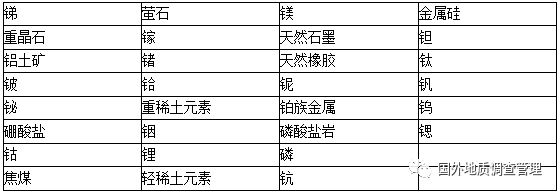 美國內政部2018年5月發布“關鍵礦產”最終名單,確定等35種礦產品:鋁(礬土)、銻、砷、重晶石、鈹、鉍、銫、鉻、鈷、螢石、鎵、鍺、石墨(天然)、鉿、氦、銦、鋰、鎂、錳、鈮、鉑族金屬、鉀鹽、稀土元素族、錸、銣、鈧、鍶、鉭、碲、錫、鈦、鎢、鈾、釩和鋯。