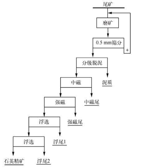3、中核贛州金瑞鈾業(yè)有限公司的馮海生等對(duì)江西一高嶺土礦尾礦進(jìn)行回收石英砂試驗(yàn)研究,通過磨礦、磁選、浮選條件試驗(yàn)及流程驗(yàn)證試驗(yàn),確定從高嶺土尾礦中回收石英砂的工藝流程為“磨礦—分級(jí)—兩次磁選—兩次浮選”。磨礦粒度控制在0.5mm以下,進(jìn)行0.4T及1.0T兩級(jí)磁選后,再在pH=2.0的條件下,進(jìn)行兩級(jí)浮選,一次浮選藥劑加入量為4.16kg/t,二次浮選藥劑加入量為3.12kg/t,最終可回收得到玻璃工業(yè)用石英砂產(chǎn)品。回收的石英砂精礦絕對(duì)產(chǎn)率為34.29%,精礦中w(SiO2)為99.53%,w(Al2O3)為0.14%,w(Fe2O3)為56ppm。