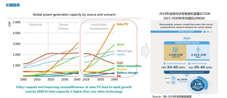 根據(jù)國(guó)際能源機(jī)構(gòu)IEA的遠(yuǎn)景規(guī)劃,2030年全球光伏累計(jì)裝容量將達(dá)2840GW。未來(lái)10年(2021-2030年)預(yù)計(jì)年均光伏新增裝機(jī)將在209GW左右。