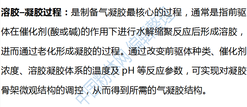 氣凝膠的制備過程主要分為兩步:第一步為通過溶膠-凝膠過程制得凝膠;第二步則是通過一定的干燥方法將凝膠內的液態物質替換為氣態從而制得氣凝膠。