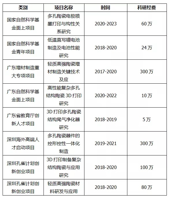 深圳大學增材制造研究所在從事3D打印研究近4年左右時間內,已獲得國家自然科學基金面上項目、青年項目、廣東省自然科學基金面上項目、廣東省重大專項、廣東省教育廳青年創新人才項目、深圳市科創委項目等各級科研項目經費支持近20項,累計科研經費近1000萬元。近年來發表SCI論文近40篇,其中TOP期刊20余篇。部分項目如下: