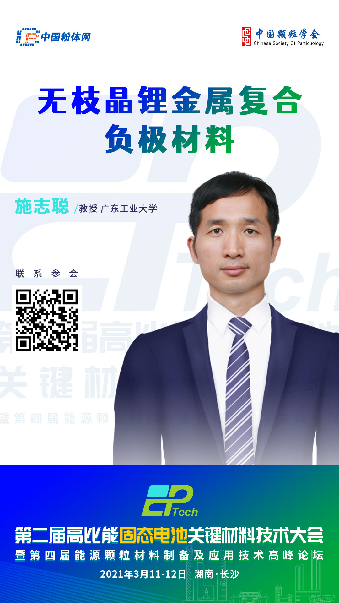 2021年3月11-12日,由中國粉體網、中國顆粒學會能源顆粒材料專委會主辦,長沙礦冶研究院先進材料研究所協辦的第二屆高比能固態電池關鍵材料技術大會將在長沙吉美國際會展酒店隆重舉行,屆時,施志聰教授將帶來報告《無枝晶鋰金屬復合負極材料研究》,與參會嘉賓分享相關研究成果。
