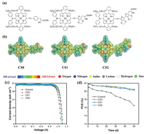 中國(guó)科學(xué)院功能納米結(jié)構(gòu)設(shè)計(jì)與組裝/福建省納米材料重點(diǎn)實(shí)驗(yàn)室研究員高鵬課題組針對(duì)鈣鈦礦太陽(yáng)能電池表面缺陷和水分侵蝕導(dǎo)致的穩(wěn)定性問(wèn)題,開發(fā)出一系列D-π-A型卟啉分子,并在使用該卟啉小分子鈍化鈣鈦礦表面缺陷作用機(jī)制的研究中取得重要進(jìn)展。
