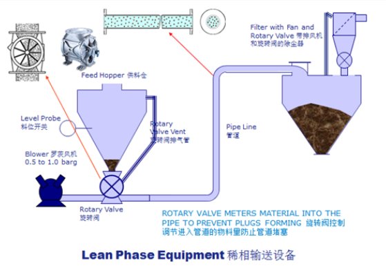 稀相輸送系統(tǒng),是通過(guò)一定流速的氣體,使得固體粉料懸浮于輸送管道中,通過(guò)氣體的運(yùn)動(dòng)將物料輸送到接收點(diǎn)。物料在管道中以懸浮狀態(tài)運(yùn)動(dòng),并通過(guò)收塵器進(jìn)行氣固分離。