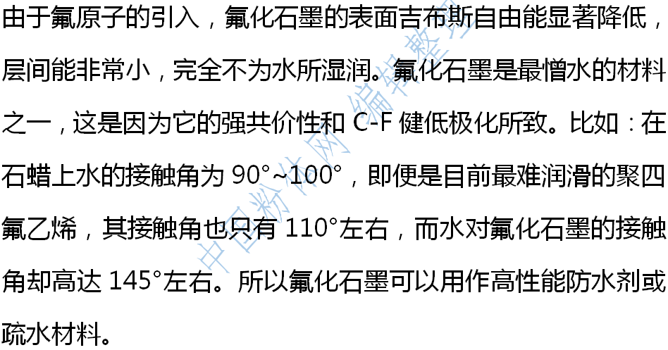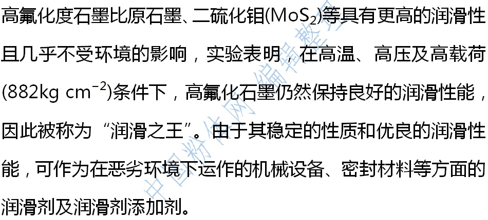 高氟化度石墨具有優良的熱穩定性,是電和熱的絕緣體,不受強酸和強堿的腐蝕,潤滑性能超過MoS2和鱗片石墨。由于氟化石墨具有許多優異性能,在軍事、航空、航天、冶金、機電、化工及特種材料領域具有廣泛應用前景。近些年,氟化石墨的價格在10~30萬美元/噸。