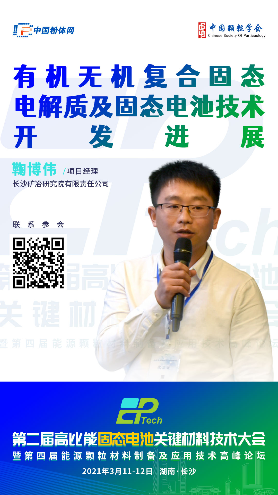 2021年3月11-12日,由中國粉體網(wǎng)、中國顆粒學(xué)會能源顆粒材料專委會主辦,長沙礦冶研究院先進(jìn)材料研究所協(xié)辦的第二屆高比能固態(tài)電池關(guān)鍵材料技術(shù)大會將在長沙吉美國際會展酒店隆重舉行,屆時,長沙礦冶研究院有限責(zé)任公司先進(jìn)材料研究所的主任研究員鞠博偉將帶來報告《有機(jī)/無機(jī)復(fù)合固態(tài)電解質(zhì)及固態(tài)電池技術(shù)開發(fā)進(jìn)展》,與參會嘉賓分享相關(guān)研究成果。