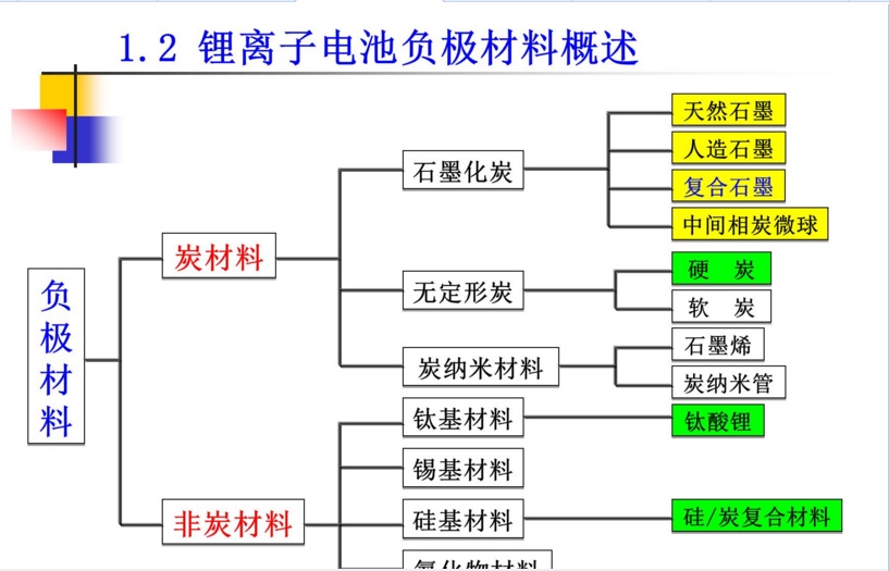 鋰離子電池由正極、負(fù)極、電解液、隔膜組成,負(fù)極材料又分為炭質(zhì)材料、石墨質(zhì)材料和非炭材料三類,研究不同材料的性能,差異對(duì)鋰離子電池發(fā)展至關(guān)重要。負(fù)極材料種類多樣,目前研究并已得到很好應(yīng)用的是天然石墨、人造石墨、復(fù)合石墨以及中間相碳微球,目前市場發(fā)展變化,硬碳、鈦酸鋰和硅/炭復(fù)合材料的研究工作也在逐漸推進(jìn)。